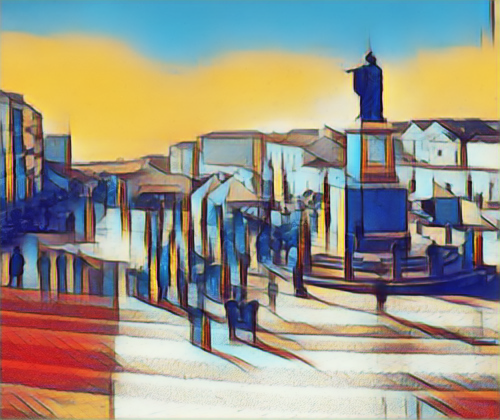 esalta la luce del tramonto e le ombre allungate sulla piazza,